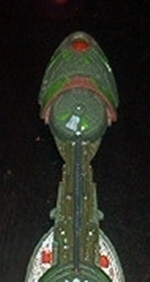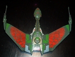 Dies ist ein recht altes Modell welches ich schon ziemlich lange habe und das schon so manchen Sturz überstanden hat. Ich glaube das war mein erstes Star Trek Modell und mein zweites oder drittes nicht Militär Modell. Ich habe mich damals für die Flügel in Kampfstellung entschieden, weil ich fand dassdas besser aussah. Ich hielt mich mit den Farben, die ich damals hatte, so gut wie möglich an die Bemalungsanleitung und etwas an die Abbildung auf dem Karton um mich zu orientieren, da nur Revell und Humbroll Farben zur Verfügung standen.